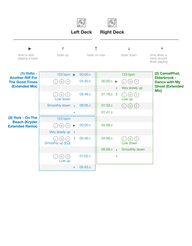 The second page of Homework with a compilation with a detailed mixing instruction with BPM, time stamps, fader and EQ actions and other necessary comments.